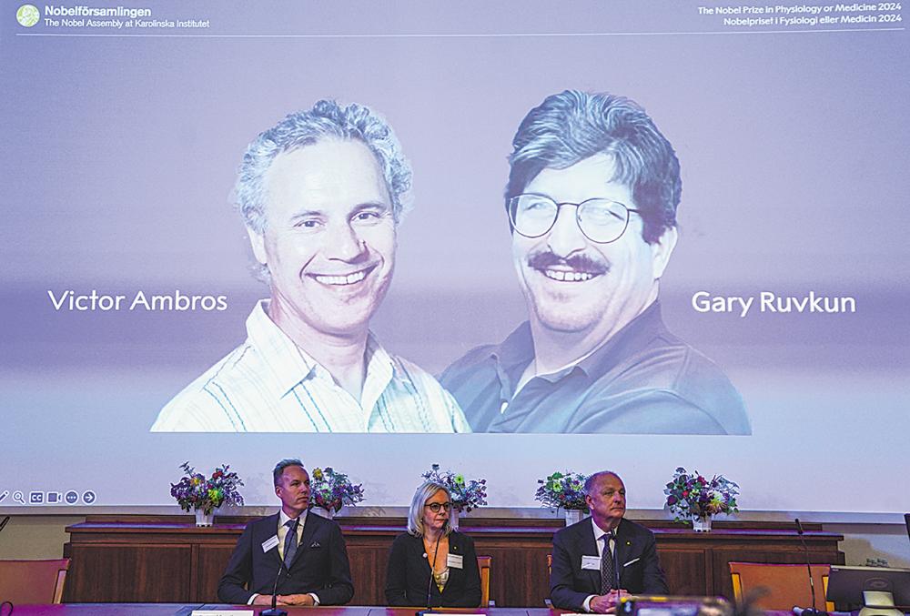 10月7日,在瑞典斯德哥尔摩举行的2024年诺贝尔生理学或医学奖公布现场,屏幕显示奖项得主美国科学家维克托·安布罗斯(左)和加里·鲁夫坎的照片。 瑞典卡罗琳医学院7日宣布,美国科学家维克托·安布罗斯和加里·鲁夫坎因发现微小核糖核酸及其在转录后基因调控中的作用而获得2024年诺贝尔生理学或医学奖。新华社记者 彭子洋 摄