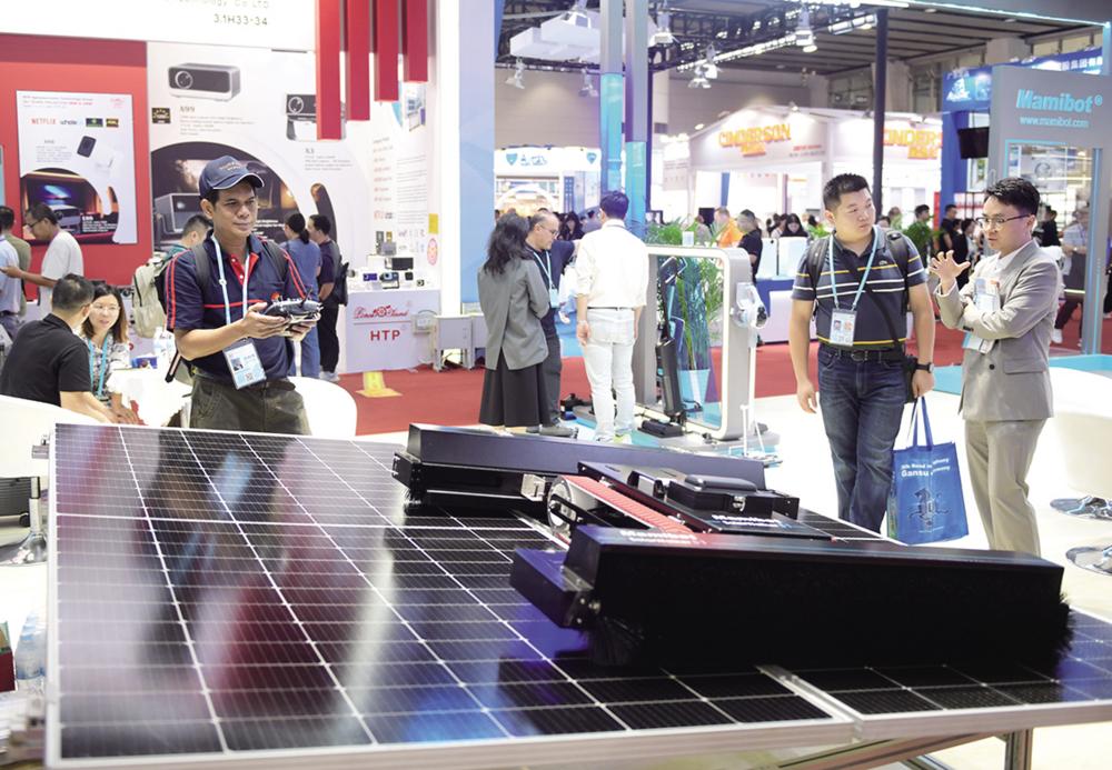 10月15日,客商在广交会展馆内遥控体验一款光伏发电板清洗设备。当日,以“服务高质量发展,推进高水平开放”为主题的第136届广交会拉开帷幕。本届广交会线下参展企业超3万家、展出新品115万件,新企业、新产品、新技术、新业态大量涌现,吸引14.7万名境外采购商预注册。本届广交会共分三期举行,分别聚焦“先进制造”“品质家居”“美好生活”题材。