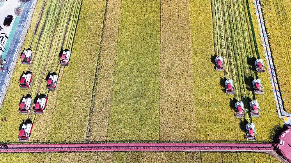 9月22日,农机在黑龙江省重要粮食产区哈尔滨市方正县的稻田中进行收割作业(无人机照片)。 深秋时节,在产粮第一大省黑龙江,处处充盈着丰收的喜悦。黑土平原上,棒穗金黄,大豆“摇铃”,忙碌的农人和轰鸣的收割机共同构成了一幅丰收画卷。 9月下旬开始,随着水稻、大豆、玉米等作物逐步进入完熟期,黑龙江粮食作物逐步开始收获。黑龙江省农业农村厅农情调度显示,全省粮食播种面积增加、高产玉米作物面积增加,整体气象条件有利于农业生产。全省将抢抓晴好天气,合理调配机具力量,适时掀起秋收高潮。新华社记者 王松 摄