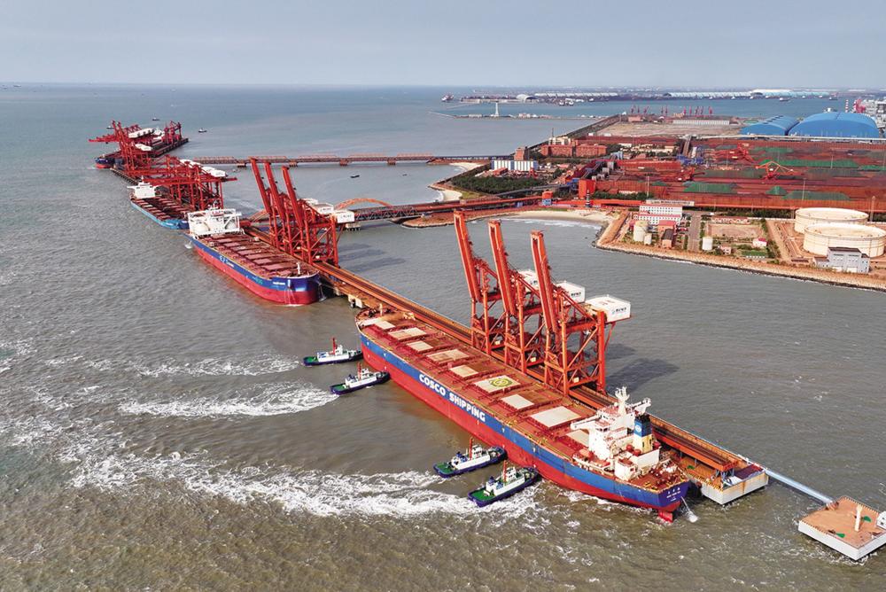 ? 10月16日,多艘轮船靠泊在唐山港曹妃甸港区矿石码头卸载(无人机照片)。 记者从河北省唐山市海洋口岸和港航管理局获悉,今年1至9月份,唐山港完成货物吞吐量63612万吨,同比增长2.62%。新华社记者 杨世尧 摄