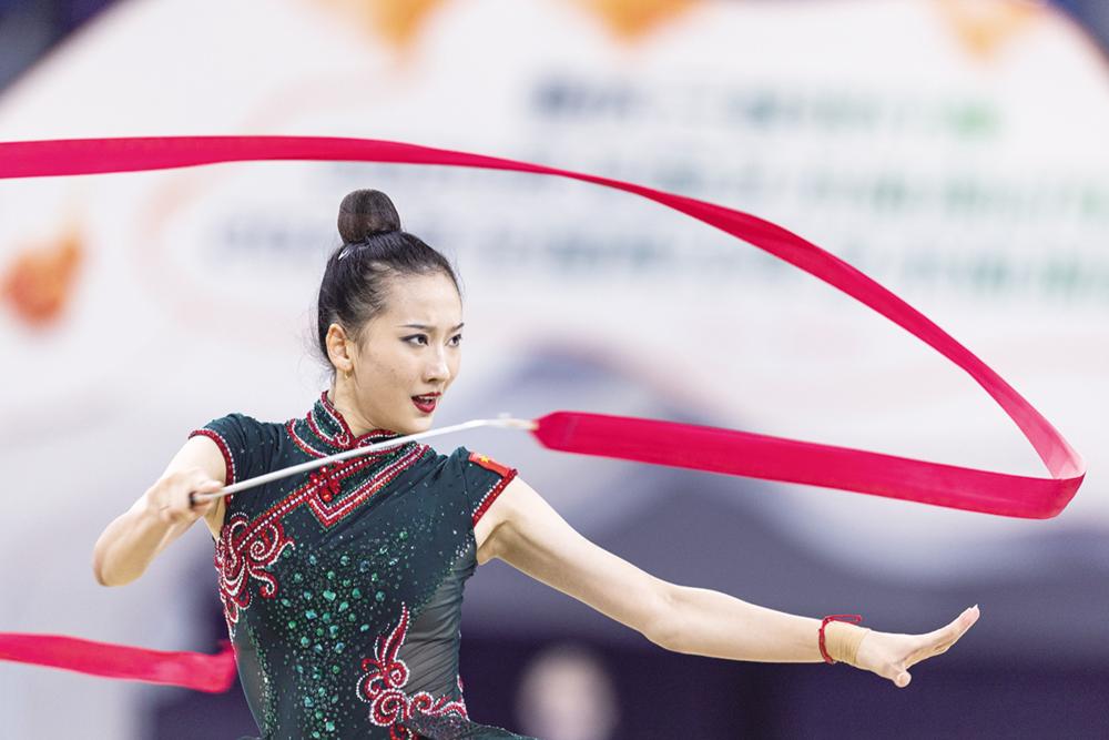 10月23日,陕西队选手王子露在个人带操决赛中。 当日,2024年全国艺术体操冠军赛成年个人圈、球、棒、带单项决赛在重庆举行。最终,陕西队选手王子露分别以36.20分、34.45分、33.40分、32.90分的成绩获得四项比赛冠军。 新华社记者 黄伟 摄