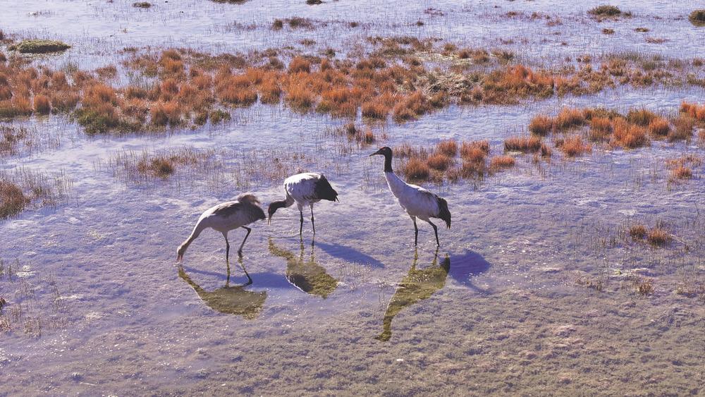 近日,在德令哈市尕海湖畔,黑颈鹤“一家三口”相依相偎,时而栖息觅食,时而传授飞行本领,吸引了记者的镜头。成群的黑颈鹤或展翅高飞、或悠哉地觅食,呈现出“鹤舞高原”的美景。 近年来,随着我州生态环境保护的力度的持续加大,德令哈市尕海湖畔的野生动物数量不断递增。 本报记者 张萍 摄影报道
