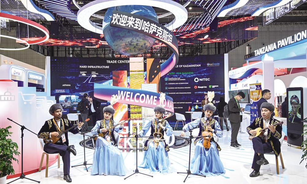11月6日,表演者在第七届进博会国家综合展的哈萨克斯坦展馆演奏乐曲。 新华社记者 张可任 摄
