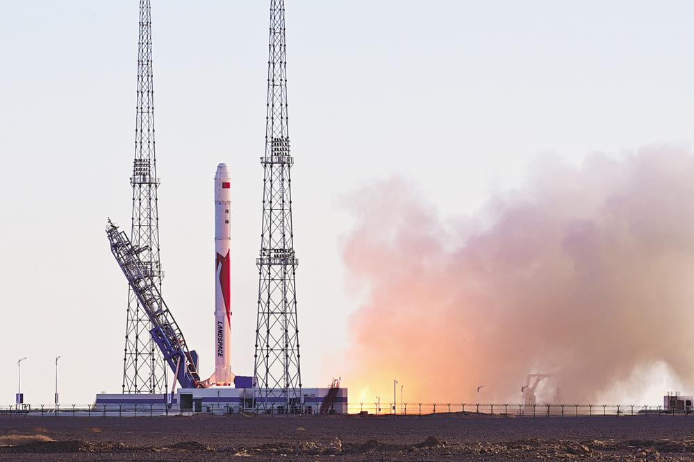 11月27日10时00分,朱雀二号改进型遥一运载火箭在东风商业航天创新试验区发射升空,将搭载的光传01、02试验星顺利送入预定轨道,飞行试验任务获得圆满成功。新华社发(汪江波 摄)