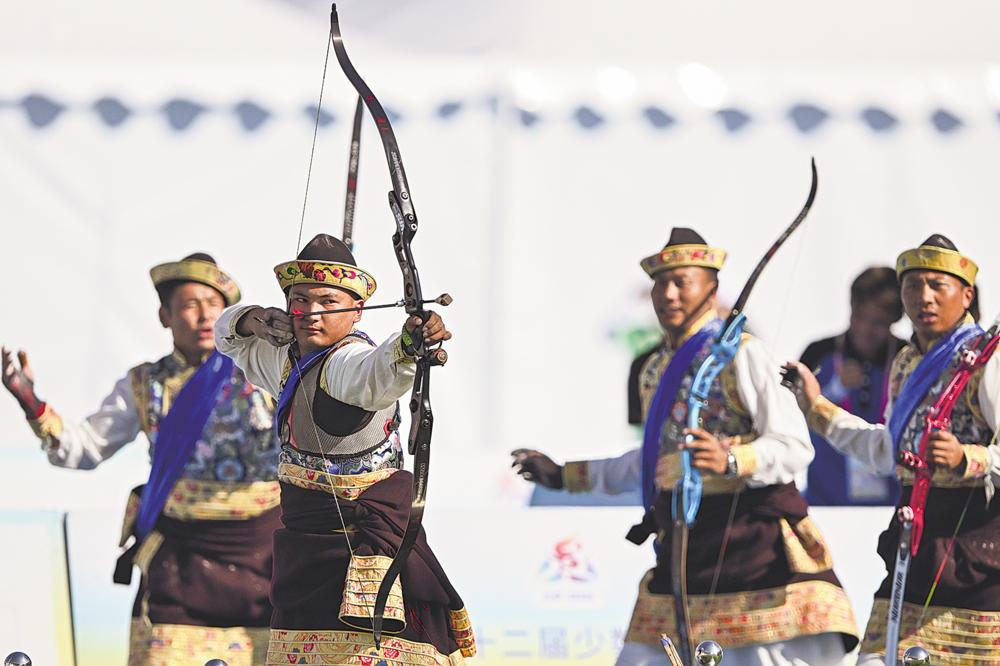 11月27日,西藏队选手表演《响箭》。 当日,第十二届全国少数民族传统体育运动会表演项目(室外)第二轮次第九组比赛在海南省三亚市举行。新华社记者 孙凡越 摄