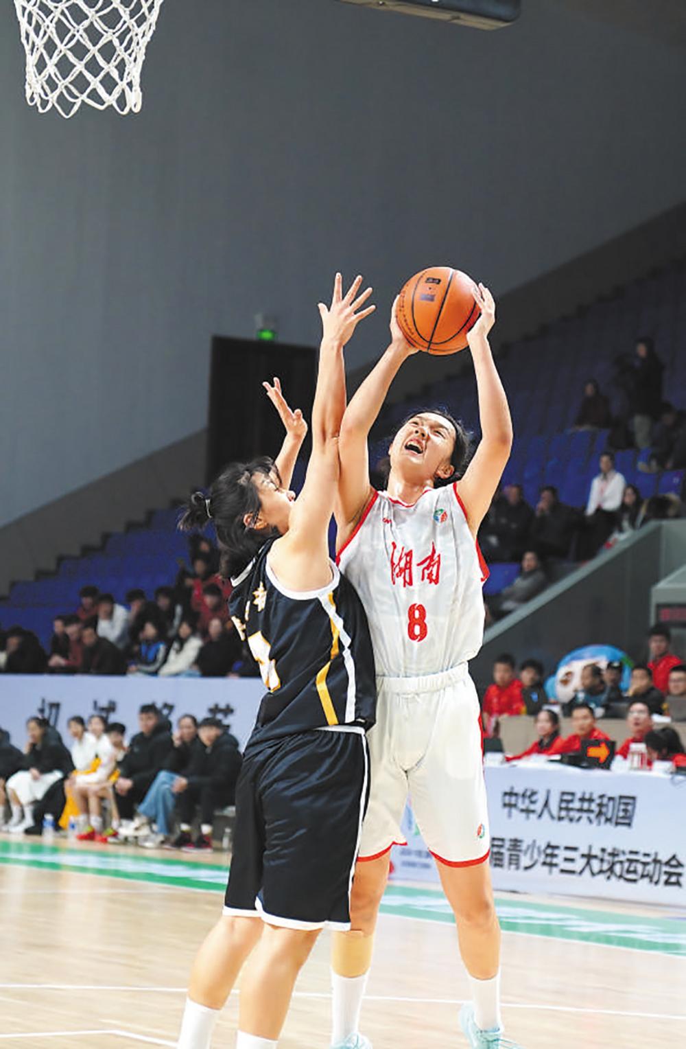湖南队球员(右)在女篮比赛中进攻。 人民日报记者 陶相安 摄
