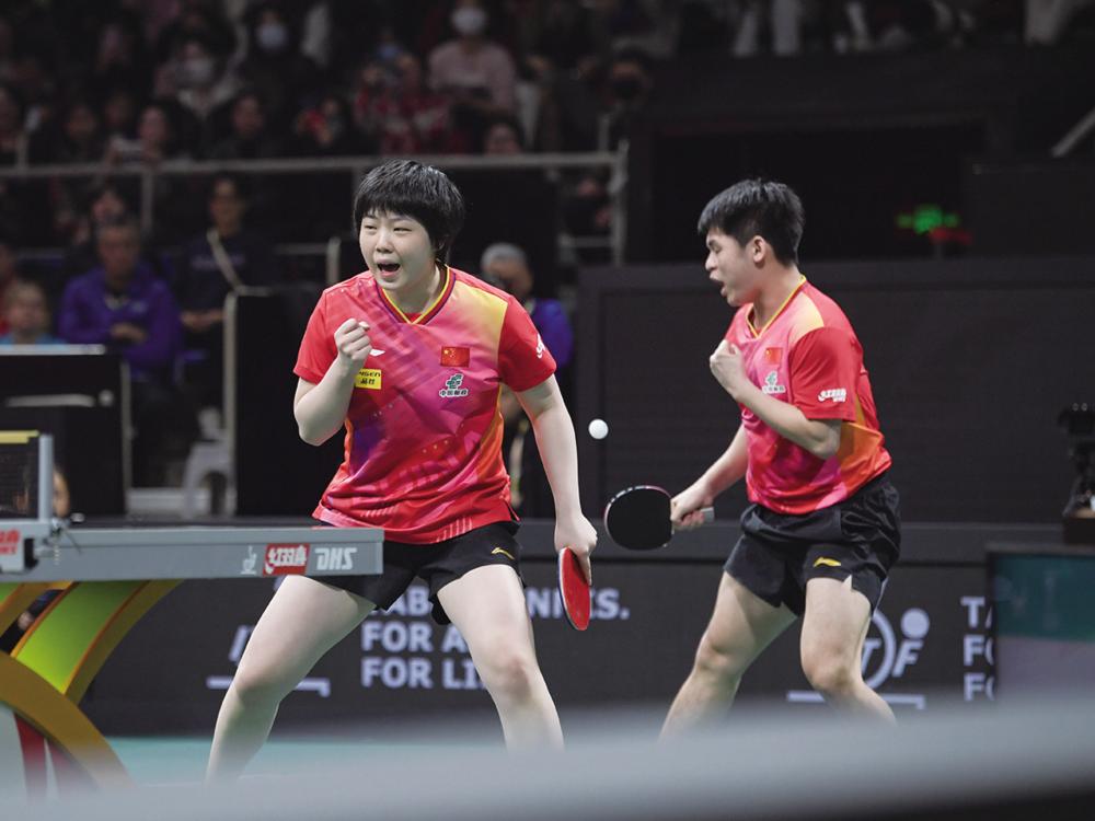 12月5日,中国队组合林诗栋/蒯曼(左)在混双比赛中。他们2比1战胜韩国队组合申裕斌/赵大成。 当日,在四川成都举行的2024年成都国际乒联混合团体世界杯第二阶段比赛中,中国队总比分8比4战胜韩国队。新华社记者 王曦 摄