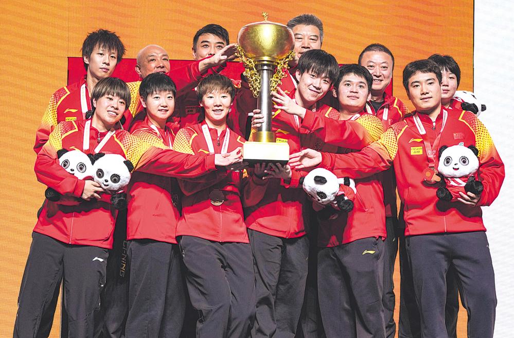 12月8日,冠军中国队在颁奖仪式上合影。 当日,在四川成都举行的2024年成都国际乒联混合团体世界杯决赛中,中国队总比分8比1战胜韩国队,获得冠军。新华社记者 王曦 摄