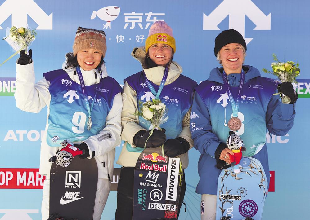12月8日,冠军美国选手马斯特罗(中)、亚军中国选手蔡雪桐(左)和季军美国选手沙夫里克在颁奖仪式上合影。 当日,2024-2025赛季国际雪联单板滑雪U型场地技巧世界杯崇礼站女子组决赛在河北张家口崇礼云顶滑雪公园举行。 新华社记者 雒圆 摄