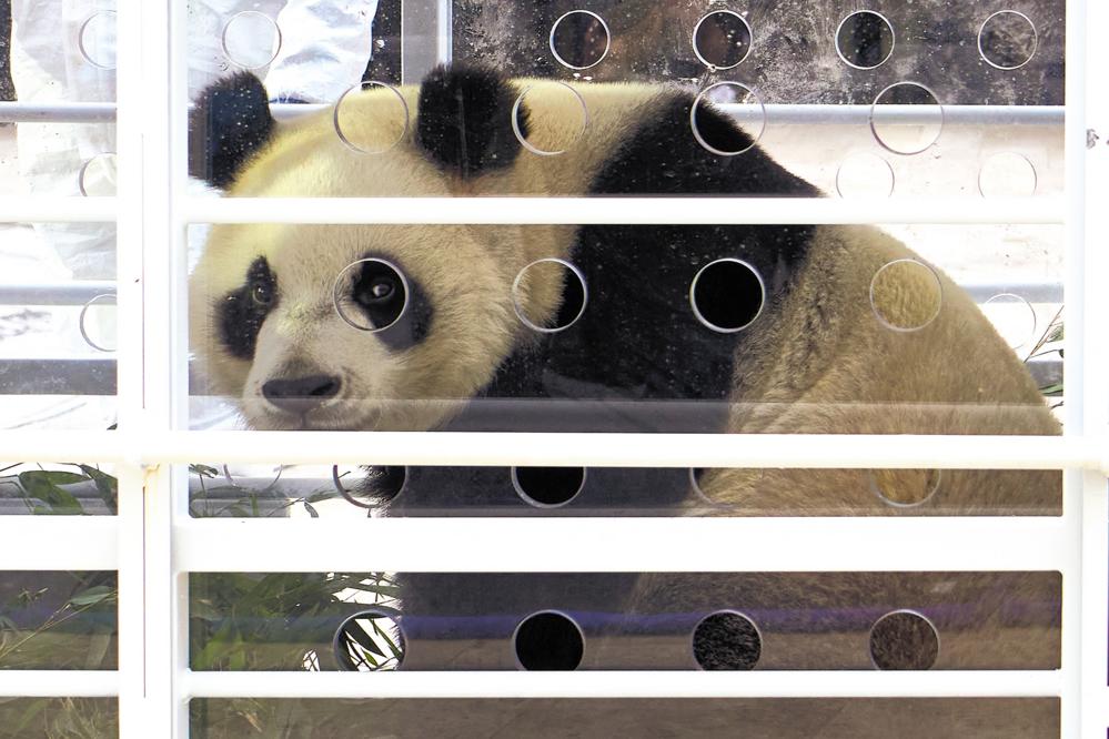 这是12月10日在比利时布吕热莱特的天堂动物园拍摄的运输箱中的大熊猫“宝妹”。新华社记者 孟鼎博 摄