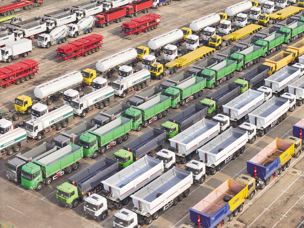 12月10日,卡车和工程机械在山东港口烟台港集结等待装船出口(无人机照片)。 海关总署12月10日发布数据显示,今年前11个月,我国货物贸易进出口总值39.79万亿元,同比增长4.9%,其中,出口23.04万亿元、进口16.75万亿元,同比分别增长6.7%和2.4%,外贸运行总体平稳。新华社发(唐克 摄)