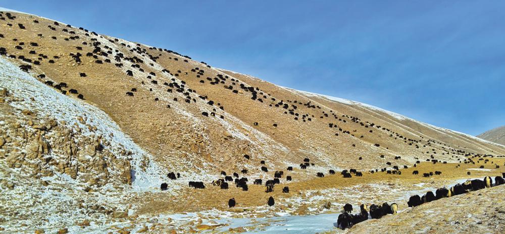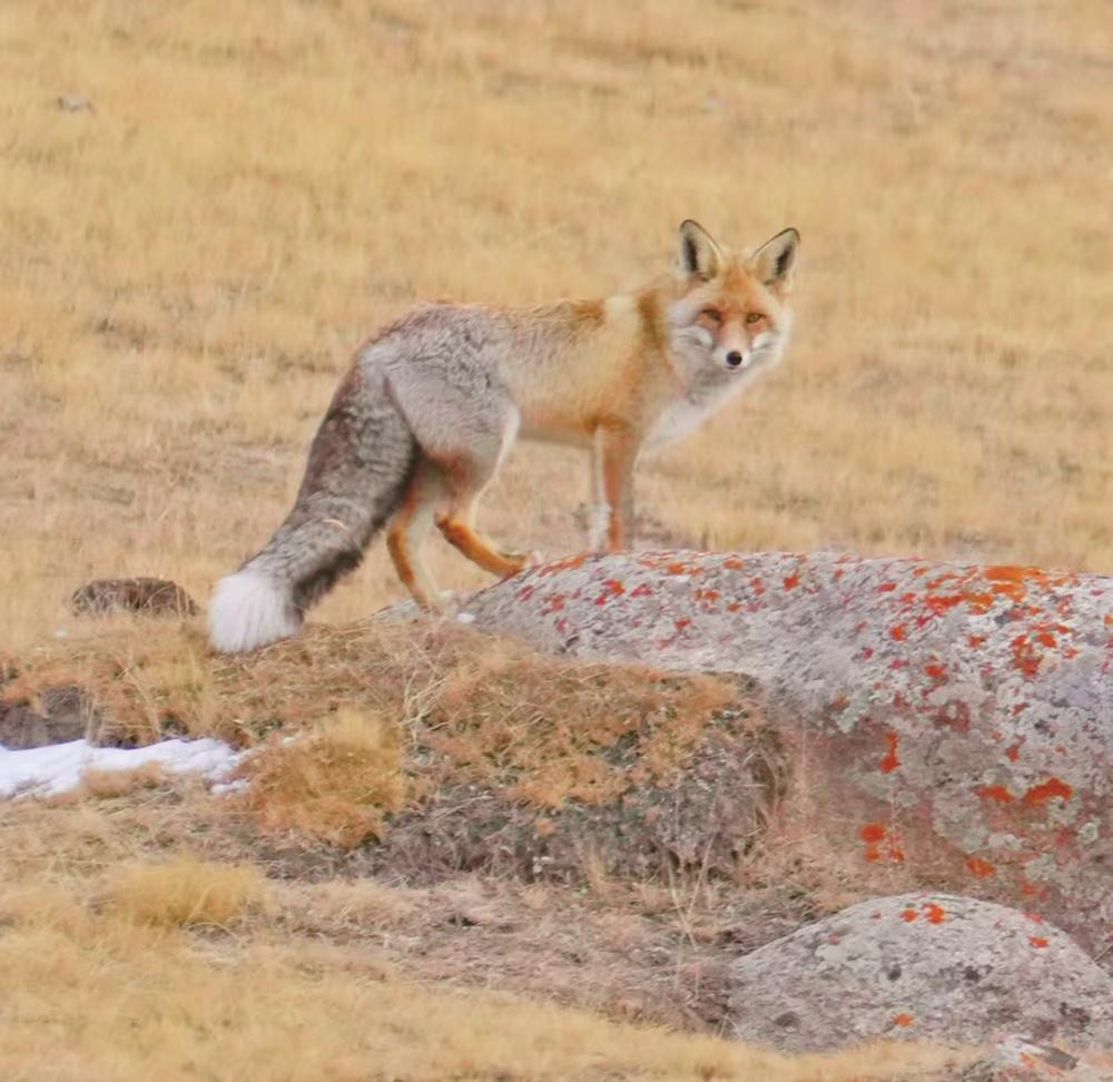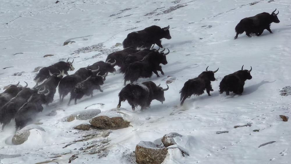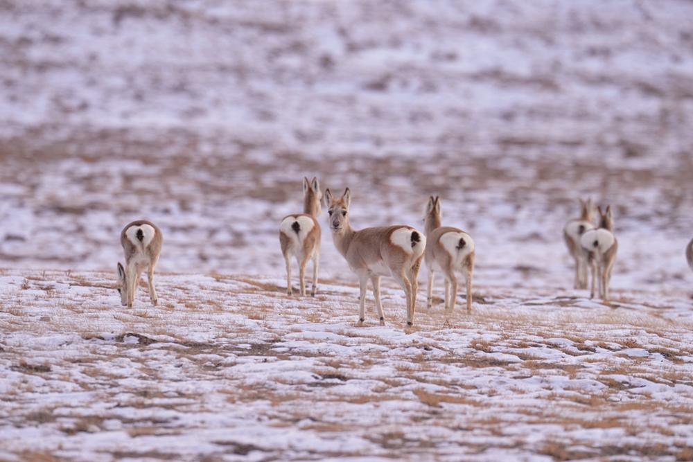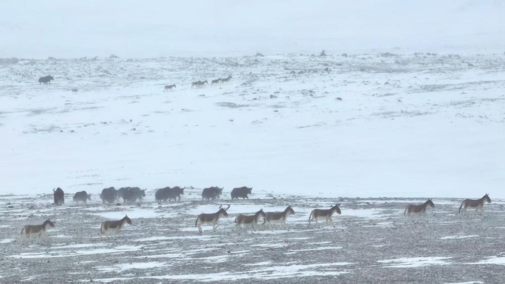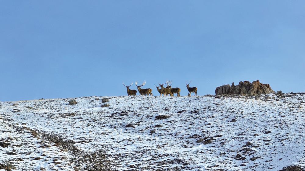 当踏入伊克拉草原深处,一幅壮美的景象豁然展现。成群的白唇鹿、岩羊、原羚、野驴、野狼、野牦牛等野生动物在雪地里悠然觅食、漫步。奔跑的野牦牛如远古的巨兽,那庞大而强壮的身躯与洁白的雪地相互映衬,更显雄浑与坚毅。远处,灵动的野驴身姿矫健,毛色与雪地形成鲜明对比,它们或三两成群相互追逐,或驻足凝望远方,为这寂静的草原增添了几分活泼与俏皮。
