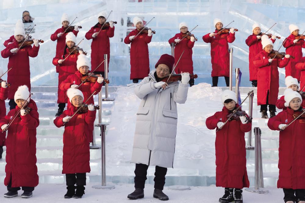 1月12日,小提琴演奏家薛苏里与哈尔滨勋菲尔德少儿艺术团的小提琴演奏者在音乐“快闪”上演奏。 当日,哈尔滨冰雪大世界园区上演音乐“快闪”,为即将到来的亚冬会助力。 新华社记者 张涛 摄