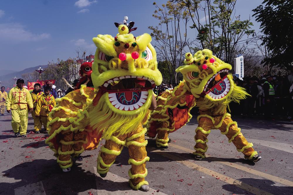 2月6日,人们在南涧县龙灯会上表演舞狮。 当日是农历正月初九,云南省大理白族自治州南涧彝族自治县举行龙灯会,来自全县8个乡镇的30多支表演队伍身着盛装齐聚南涧县城,闹龙灯庆新春。 新华社记者 陈欣波 摄
