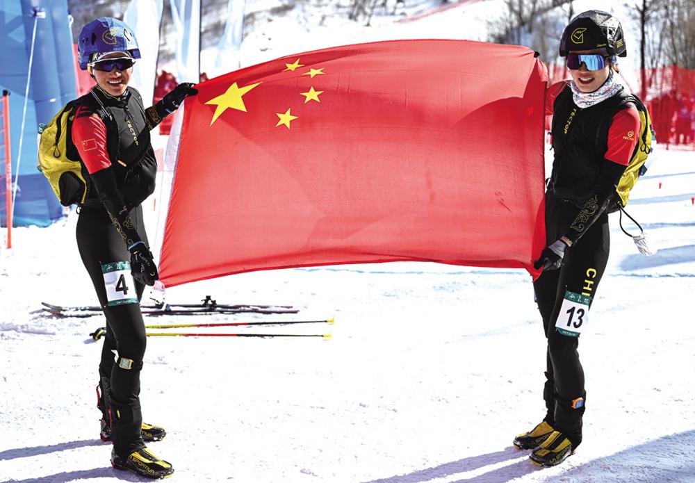 2月9日,中国选手次旦玉珍(左)与队友于婧萱庆祝。次旦玉珍获得冠军,于婧萱获得亚军。 当日,第九届亚冬会滑雪登山女子短距离决赛在亚布力举行。 新华社记者 谢剑飞 摄