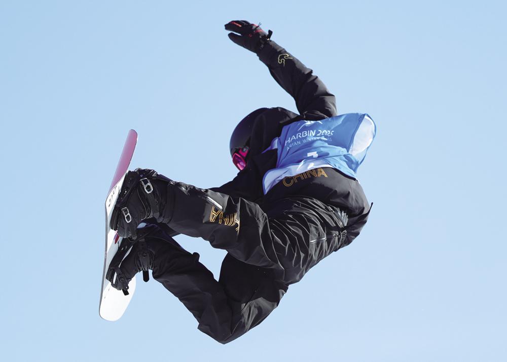2月10日,中国选手姜鑫杰在比赛中。 当日,在亚布力举行的第九届亚冬会单板滑雪男子大跳台决赛中,中国选手杨文龙夺冠,姜鑫杰获得亚军。新华社记者 杨青 摄