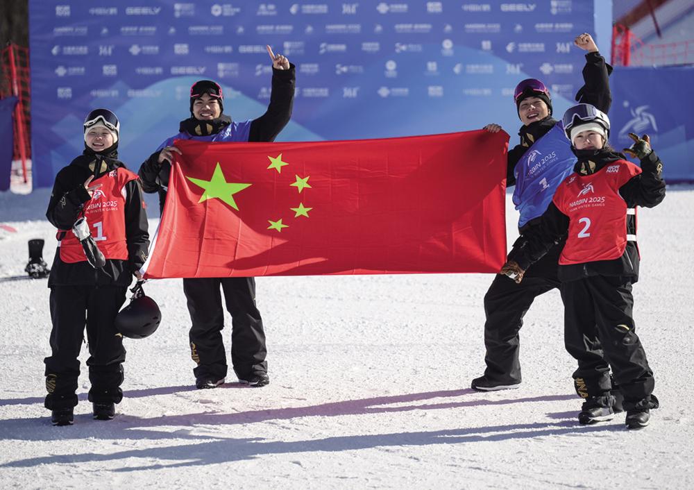 2月10日,中国选手张小楠、杨文龙、姜鑫杰与熊诗芮(从左至右)在比赛后庆祝。 当日,在亚布力举行的第九届亚冬会单板滑雪女子大跳台决赛中,中国选手熊诗芮夺冠,张小楠获得亚军;在男子大跳台决赛中,中国选手杨文龙夺冠,姜鑫杰获得亚军。新华社记者 杨青 摄