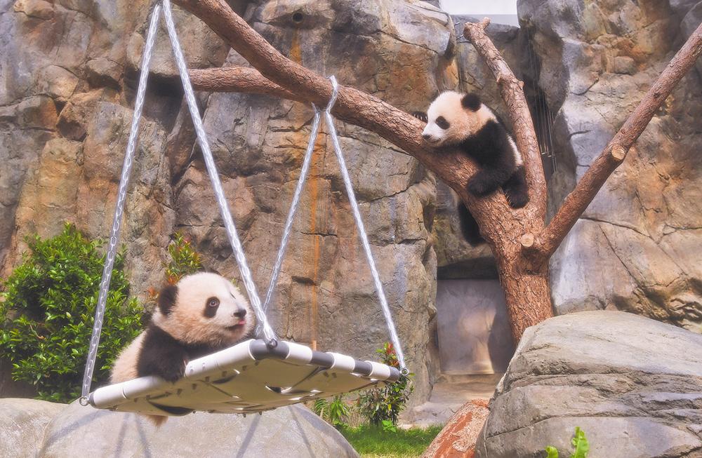 2月15日,大熊猫宝宝在香港海洋公园“大熊猫之旅”熊猫生活场馆内玩耍。 当日,香港海洋公园为首对龙凤胎大熊猫宝宝举行亮相仪式,并庆祝它们半岁生日。这对龙凤胎大熊猫宝宝将于2月16日正式与公众见面。新华社记者 陈铎 摄