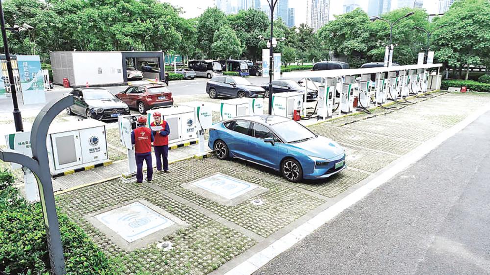 图③:国网杭州市萧山区供电公司工作人员正对钱江世纪城无线充电站设备进行调试。姚靖霖 摄