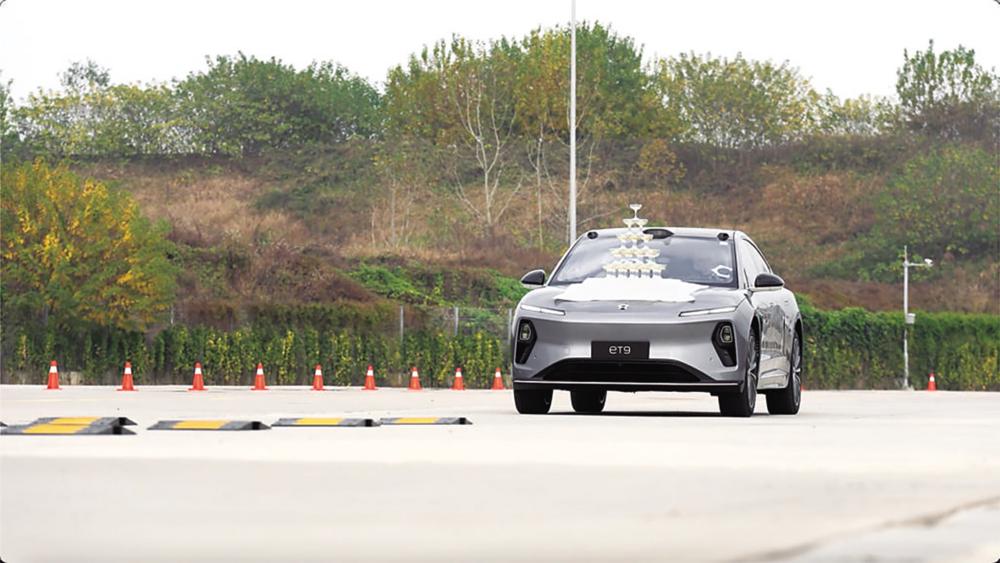 图⑤:蔚来汽车搭载5层香槟塔过连续减速带,以测试天行全主动悬架化解颠簸的能力。蔚来汽车 供图