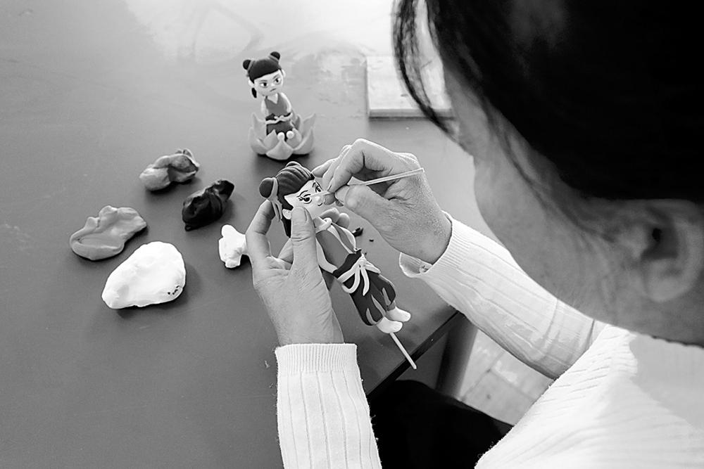 近日,泥塑艺人杨爱华在山东省滨州市的一所小学创作哪吒主题泥塑。 新华社发(贾海宁 摄)