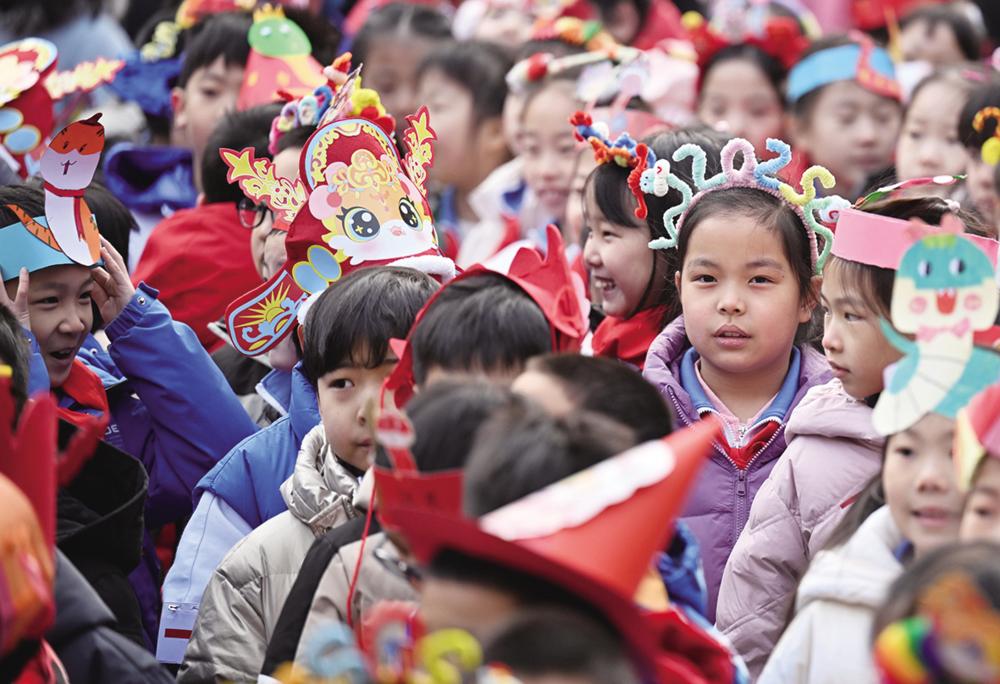 近日,在天津市和平区新星小学,学生们头戴蛇年装饰参加开学典礼。