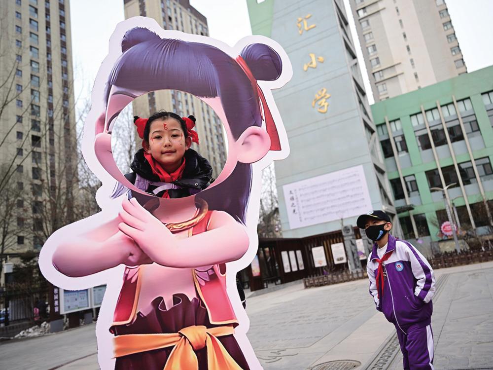 2月23日,西宁市城西区文汇小学学生在“哪吒”造型装饰前留影。 当日,青海省西宁市小学迎来新学期。新华社记者 张龙 摄