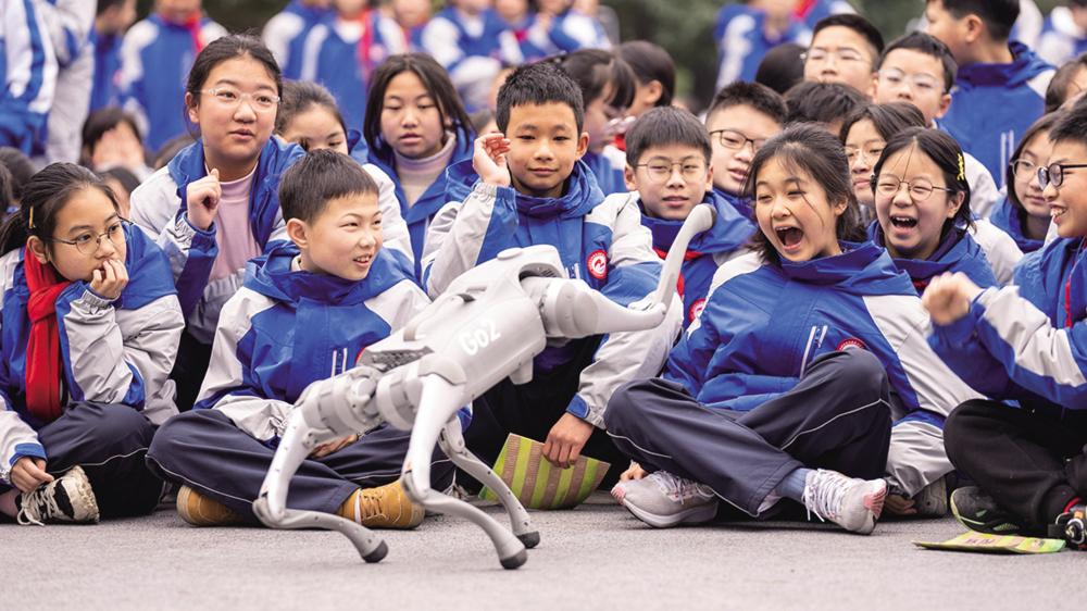 近日,四川眉山市彭山区第二中学学生在开学第一课科普活动上观看机器狗表演。 当日,全国各地举办了多种多样的“开学第一课”主题活动。 新华社发(翁光建 摄)
