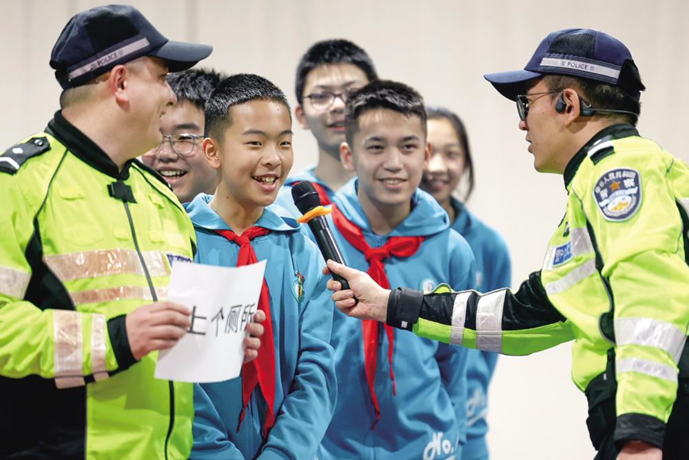 近日,乌鲁木齐市公安局交通警察支队民警在乌鲁木齐市第一小学开展交通安全宣传活动时,与孩子们互动做游戏。 新学期伊始,为营造安全和谐的校园环境,乌鲁木齐市不少中小学以“安全教育”作为开学必修内容,开展形式多样的安全知识进校园活动。 新华社记者 王菲 摄