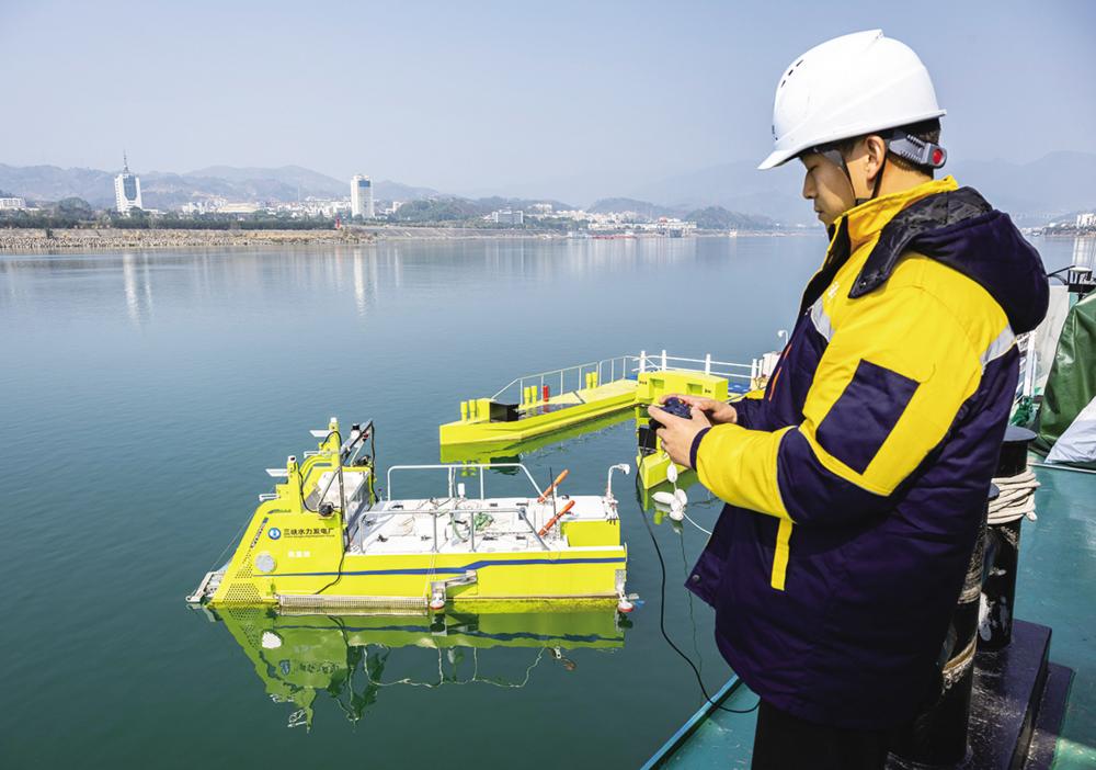 2月25日,技术人员操控智能清洁机器人在三峡大坝坝前水域收集水上漂浮物。 近年来,三峡集团长江电力三峡电厂先后开发检测维护机器人、设备巡检机器人、水域作业机器人、智慧仓储机器人等多种类型的“机器人编队”,提升运维效率和安全水平,为大国重器安全运行保驾护航。新华社发(郑家裕 摄)