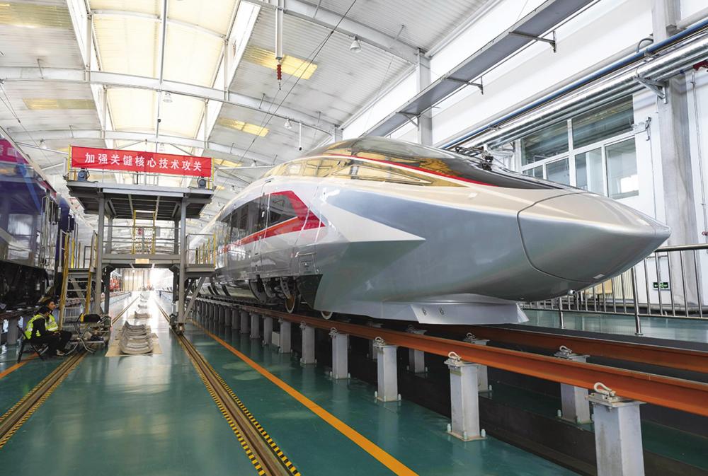 这是在铁科院国家铁道试验中心接受试验验证的CR450动车组样车(2月25日摄)。 近日,运营时速400公里的高铁列车CR450动车组样车在北京发布。目前相关团队正在开展一系列科学试验和性能验证,为动车投入商业运营创造条件。 新华社记者 邢广利 摄