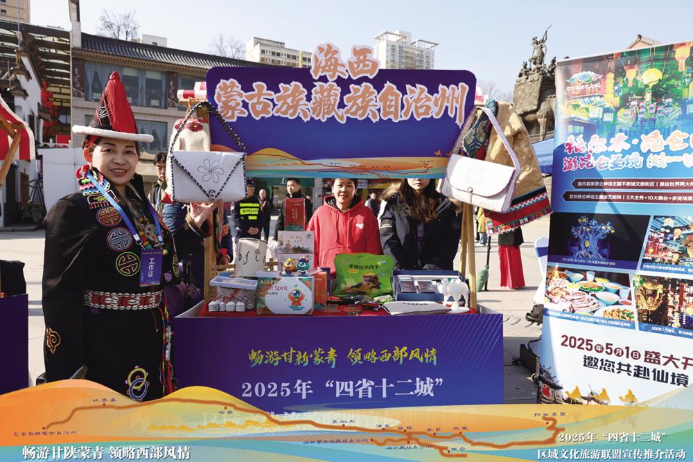 3月17日,由甘肃省武威市牵头,联合酒泉市、嘉峪关市、金昌市、张掖市,新疆巴音郭楞蒙古自治州、吐鲁番市、哈密市,内蒙古阿拉善盟,以及青海海北藏族自治州、海西蒙古族藏族自治州共同主办的“畅游甘新蒙青 领略西部风情”——“四省十二城”区域文化旅游联盟宣传推介活动在西安举行。 推介会上,各联盟城市通过现场推介、文创产品展示以及精彩纷呈的主题演出,全方位展现了各地区秀美的自然风光、深厚的历史文化底蕴和独具特色的民俗风情,为西安市民和游客呈上了一场丰富多元的文化盛宴。 图 由海西州文体旅游广电局 提供