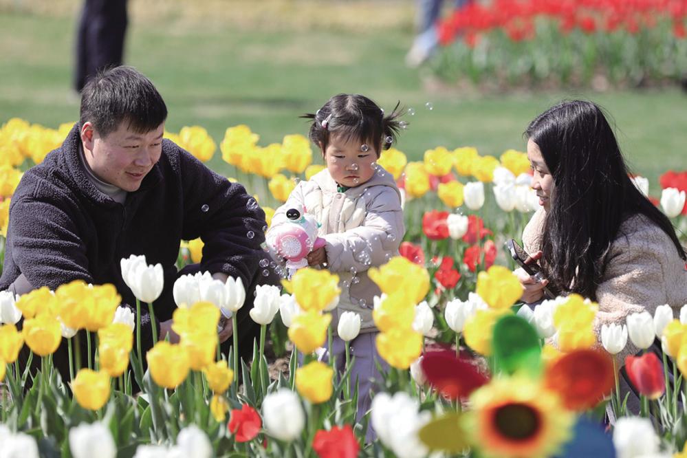 3月17日,人们在浙江省嘉兴市经济开发区姚家荡公园观赏郁金香。 各地春花陆续绽放,神州大地处处都是烂漫春景。新华社发(金鹏 摄)