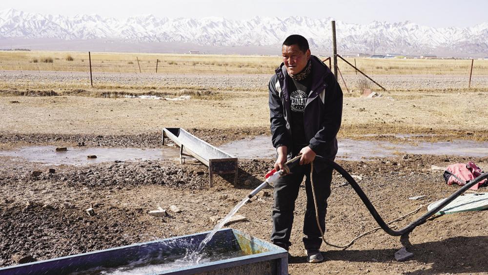 记者踏入蓄集乡贡艾里沟村的大草原时,春雪尚未完全消融,草原上一口口水井与出水管道纵横交错,构成了一幅独特的景象。走进牧民希德尔家中,恰逢希德尔的儿子开着三轮车前来接水。只见他熟练地将水桶放置在水龙头下,轻轻拧开水龙头,清澈的自来水便喷涌而出,不一会儿,一大桶水就接满了。