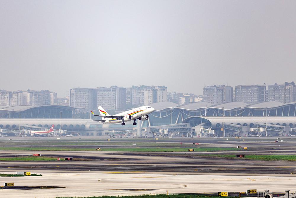 4月9日,一架飞机从重庆江北国际机场起飞。 当日,重庆江北国际机场T3B航站楼正式投用。T3B航站楼总建筑面积36.3万平方米,与T3A航站楼由旅客捷运系统连接,作为卫星厅仅承担飞机停靠、上下旅客等功能,旅客办票及安检仍在T3A航站楼。新华社记者 黄伟 摄