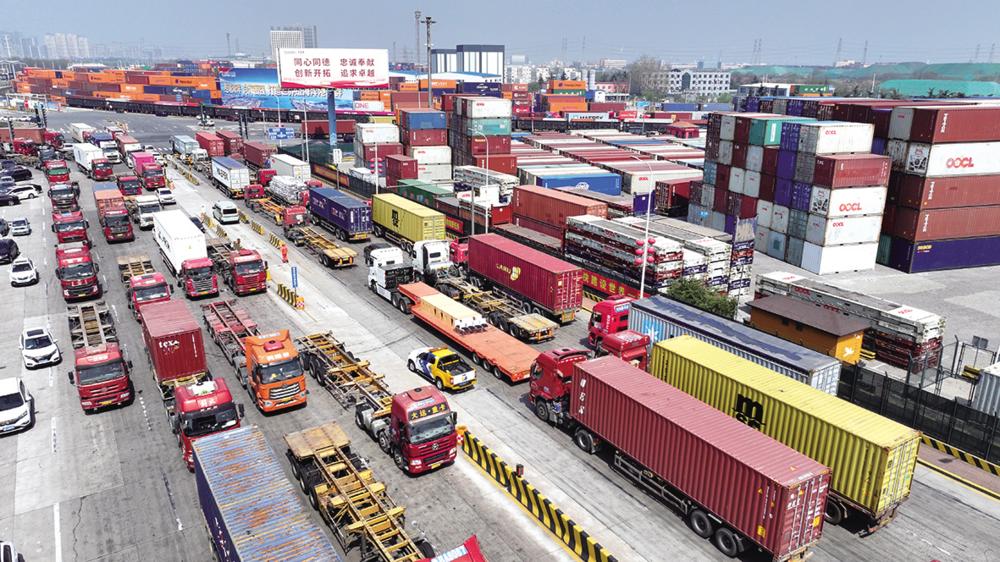 4月10日,车辆在山东港口青岛港前湾集装箱码头运送集装箱(无人机照片)。 据山东省港口集团有限公司统计数据显示,2025年一季度,该集团的货物吞吐量、集装箱吞吐量同比增长分别超过4%、7%,展现出强劲的发展动能和韧性。 新华社记者 李紫恒 摄