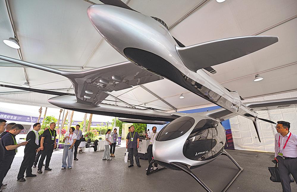 4月14日,观众在观看一款电动垂直起降固定翼运载型无人机。 第五届中国国际消费品博览会首次设立低空经济展示专区,聚焦智能立体出行与产业协同创新,展示跨城物流、应急救援、低空文旅等多领域应用场景。 新华社记者 郭程 摄