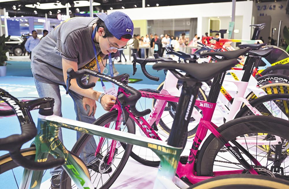 4月16日,观众在消博会现场观看国产自行车。 在第五届中国国际消费品博览会上,全国30多个省区市携国货精品参展。从非遗技艺到科技潮品,国货产品通过传承与创新引领消费新潮流,向世界展示了中国品牌的魅力,为中国经济的持续发展和消费市场的繁荣注入新活力。 新华社记者 郭程 摄