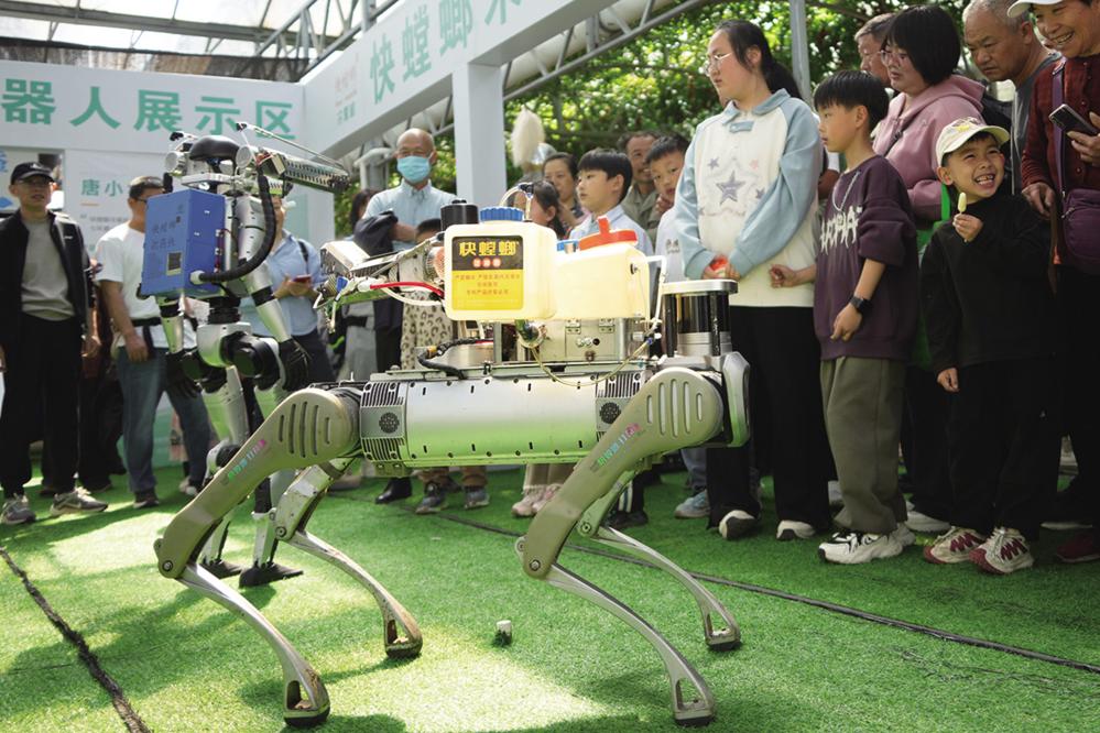 4月20日,在第二十六届中国(寿光)国际蔬菜科技博览会上,人们在观看农业机器人展示。 当日,第二十六届中国(寿光)国际蔬菜科技博览会在山东潍坊寿光市蔬菜高科技示范园开幕。本届博览会主展区总面积达45万平方米,包括11个室内展馆、日光温室高产栽培区、蔬菜博物馆、休闲农场及室外优质农产品展区,实地种植展示2600多个蔬菜品种,80多种先进种植模式,100多项新技术。博览会将持续至5月30日。 新华社记者 徐速绘 摄