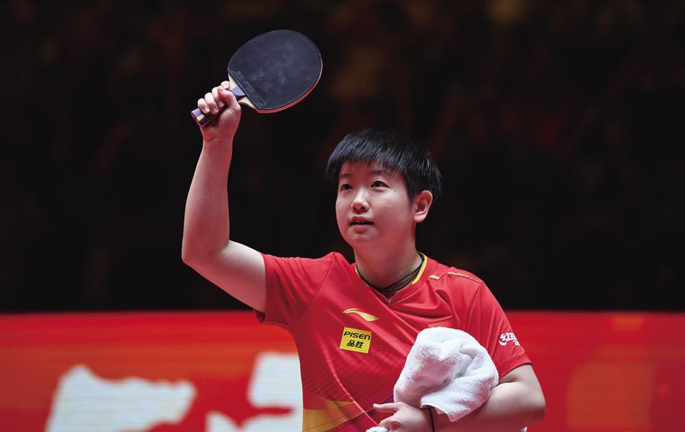 4月20日,孙颖莎庆祝获胜。 当日,在中国澳门举行的2025年国际乒联男子及女子世界杯女子单打决赛中,中国选手孙颖莎4比0战胜中国选手蒯曼,夺得冠军。 新华社记者 陈铎 摄