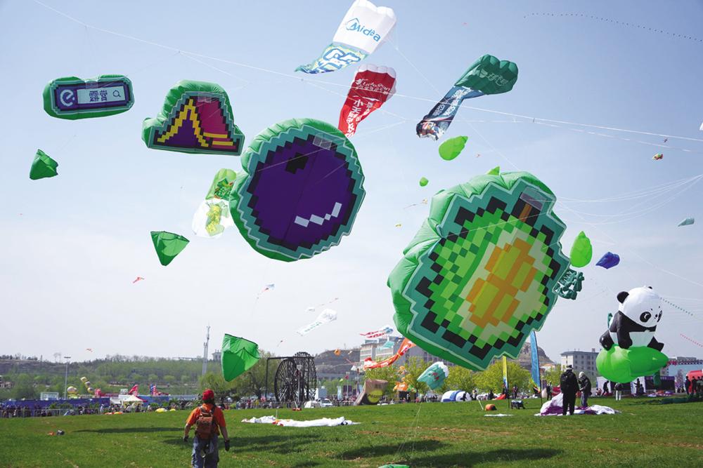 这是第42届潍坊国际风筝会万人风筝放飞活动上的风筝(4月19日摄)。 4月19日,第42届潍坊国际风筝会在山东省潍坊市开幕并举行万人风筝放飞活动。新华社记者 徐速绘 摄