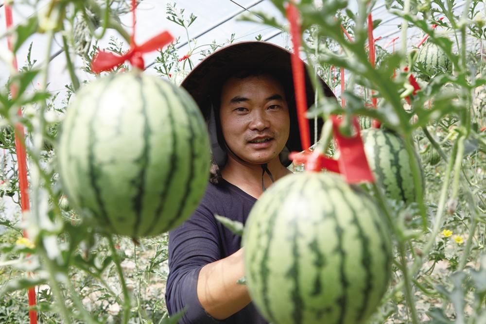 近日,在德令哈市柯鲁柯镇莲湖村的果蔬采摘园里,记者看到,温实大棚内西瓜的藤蔓顺着支架垂挂下来,浑圆的西瓜隐藏在叶子间,一派瓜果飘香的喜人景象。 据了解,莲湖村果蔬采摘园的温室西瓜目前已成熟上市,预计亩产约3500公斤。莲湖村通过种植果蔬有效拓宽了村民的增收渠道。 本报记者 查宝音 摄影报道