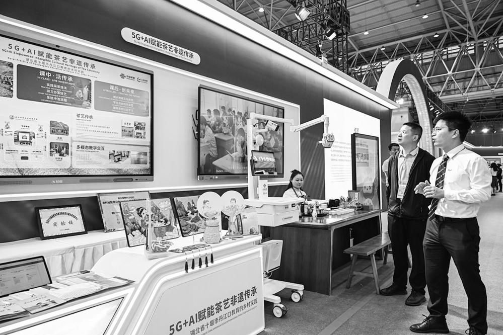 5月14日,参观者在2025世界数字教育大会教育数字化成果展上参观。 当日,以“教育发展与变革:智能时代”为主题的2025世界数字教育大会在武汉开幕。 新华社记者 杜子璇 摄