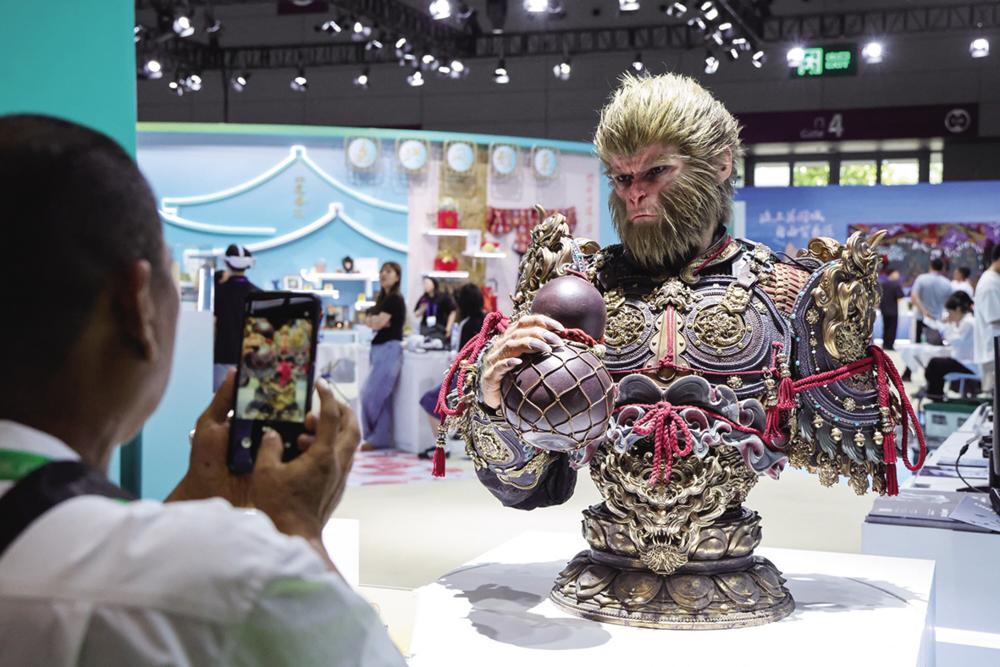 5月23日,观众在文博会上拍摄黑神话悟空半身像。 在深圳举行的第二十一届中国(深圳)国际文化产业博览交易会,“文创中国”展区大幅扩大,吸引全国各地百余家机构、企业参展;泡泡玛特、东莞“中国潮玩之都”产业集群等潮玩产品代表也集中亮相。新华社记者 梁旭 摄