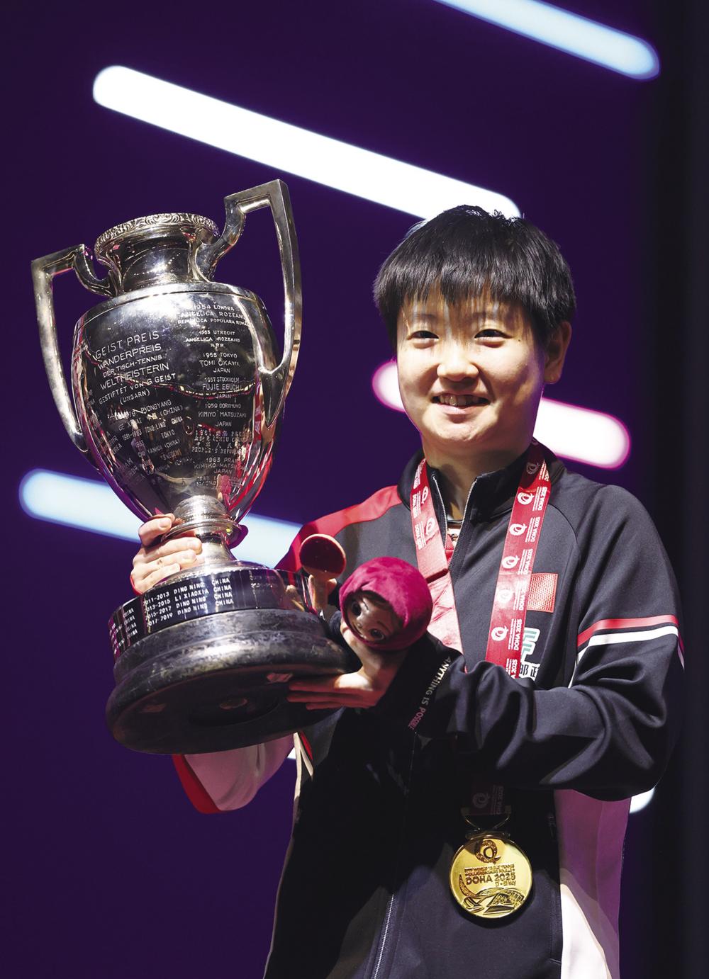 ? 5月25日,冠军中国选手孙颖莎在颁奖仪式上捧起奖杯。 当日,在卡塔尔多哈举行的2025世界乒乓球锦标赛女子单打决赛中,中国选手孙颖莎4比3战胜中国选手王曼昱,夺得冠军。新华社记者 刘续 摄