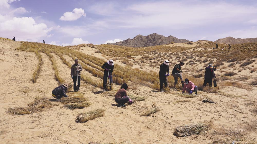 施工现场负责人何光良介绍,“三北”荒漠化防治与生态修复工程于3月底进场施工,目前每日可完成约100亩稻草沙障铺设。全体施工人员正抢抓工期,在确保工程质量的前提下,全力推进项目建设,力争按时完成所有生态修复任务。