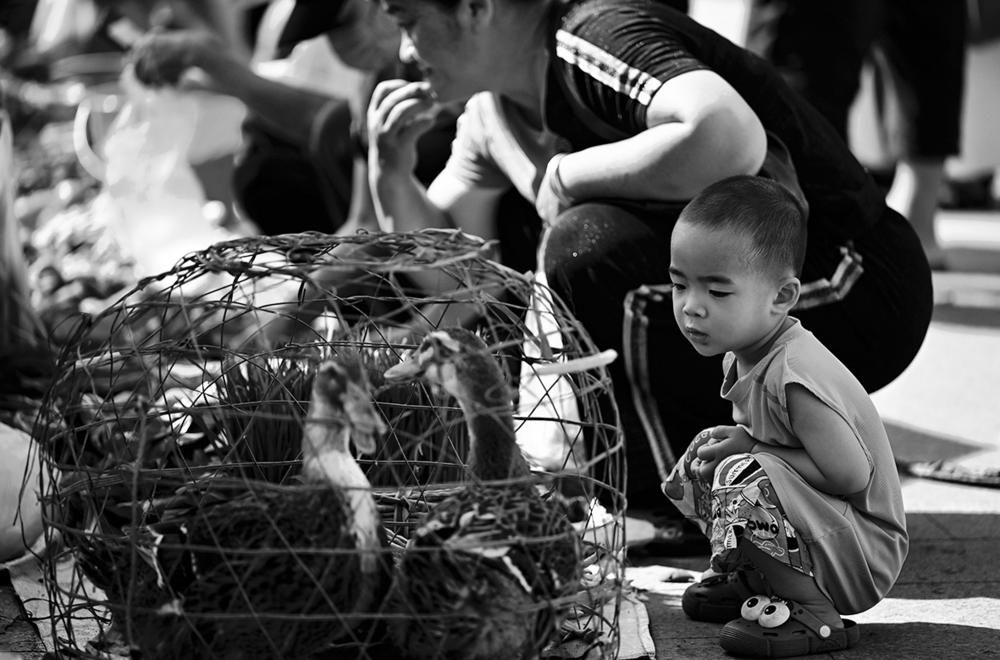 6月7日,小朋友在打量集市上售卖的鸭子。 每逢周末,海南省五指山市南圣河畔的集市上都热闹非凡,农民带来的特色农产品吸引了许多市民和游客前来采购。这个由当地政府主办的周末集市,成为消费帮扶助农、助力乡村振兴的平台。 新华社记者 郭程 摄