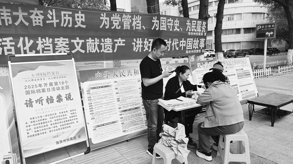 记者 边红霞 摄 本报讯(记者 边红霞 田曲吉尖措) 6月9日,我州档案馆组织各市、县、工委办公室(档案局)、档案馆,各企事业单位集中在德令哈市中心广场开展以“请听档案说”为主题的国际档案日宣传活动。 活动现场,工作人员通过悬挂横幅、发放宣传彩页、摆放档案文创品、有奖知识问答等方式,向过往群众普及档案日的来历、档案的种类及档案工作的重要性,详细讲解档案查询利用流程。活动让群众走近档案、了解档案、感受档案文化,有效提高了群众对档案法律法规及相关知识的认知,增强了档案意识和法治观念,进一步扩大了档案工作的社会知晓度和影响力。 海西州档案馆工作人员毛常青表示:“今天是第18个国际档案日,我们举办系列活动旨在提升全社会对档案和档案工作的认识与支持,充分发挥档案‘保存历史、服务现实、启迪未来’的独特作用,让档案这一宝贵遗产和资源为构建更具文化底蕴的新海西贡献力量。” 通过此次宣传活动,群众重视档案、关心档案的意识进一步增强,档案服务基层、服务民生的触角不断延伸。