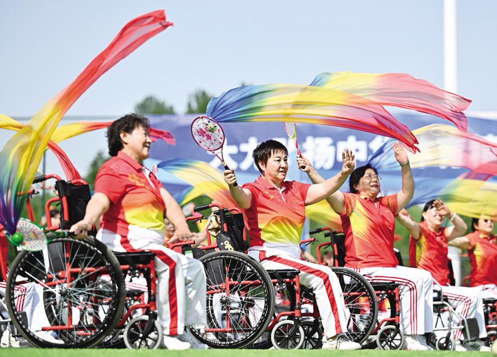 ↑6月10日,群众在活动上参加残疾人柔力球展演。 当日,由国家体育总局群众体育司、宁夏回族自治区体育局、银川市人民政府主办,银川市体育局、金凤区人民政府承办的纪念“发展体育运动 增强人民体质”题词73周年全民健身主题活动在银川市金凤区览山公园举行。 新华社记者 王鹏 摄