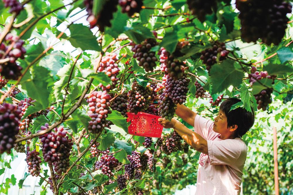 ←6月10日,河北省迁西县滦阳镇关姑寺村农民采摘葡萄。 新华社发(刘满仓 摄)
